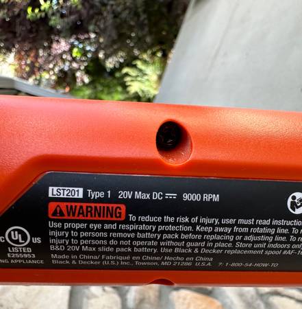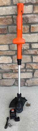 The BLACK+DECKER LST201 is a 20V MAX* Lithium 10" String Trimmer/Edger with Automatic Feed Spool and lightweight design. It converts easily from trimmer to edger and features a 20V MAX* Lithium Ion 1.5Ah battery. The trimmer has a 10" cut swath , 0.065 in. line size , and 9,000 RPM. The product weighs 4.5 lbs. and has an adjustable height and handle for user comfort. It Includes a battery, charger, AFS spool, extra string spool, guard and Owner's Manual. Excellent condition. $60