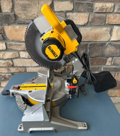 I have a DeWALT 15 Amp Corded 12 in. Single Bevel Compound Miter Saw DWS715 that is in like new condition - used once for small home improvement project. This miter saw is powered by a 15 Amp motor to drive 4,000 rpm, delivering extended power and durability. This 12-in miter saw features a stainless-steel miter detent plate and cam miter lock that provide repeatable accuracy and durability with easy adjustments. The saw has tall sliding fences that support 5-1/2 in. of base molding vertically and 5-1/2 in. crown molding vertically nested. The lightweight design and built-in carry handle make this a portable miter saw that's easy to transport around the job site. It folds down for easy storage in your workshop or garage. Includes original general purpose 32-teeth carbide-tipped blade, a brand new finish 60-teeth carbide-tipped blade, clamp assembly, blade wrench and Instruction Manual. $250