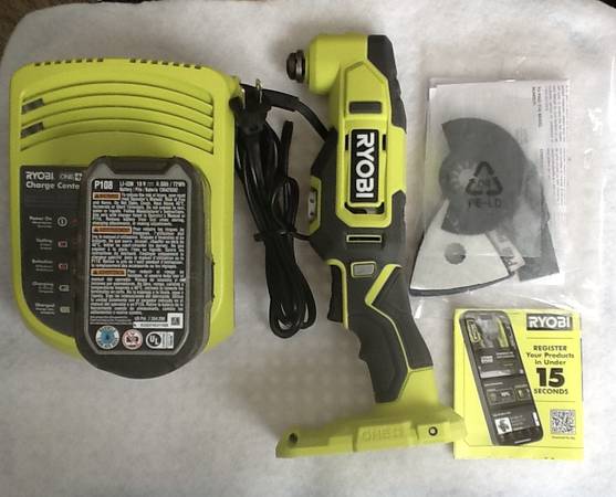 I have a new RYOBI 18V ONE+ Oscillating Multi-Tool that delivers more power to achieve up to 80% faster cutting and 2.5X more cuts on a single charge when cutting through material like wood, drywall, plastic and metal. A 3.8 oscillation angle gives this tool the power for demolition and its variable speed dial enables speeds from 10,000-20,000 OPM providing control in detailed applications. Eliminate fatigue with the on-board lock-on button during extended tasks. And when working in dimly lit areas, use the LED work light to illuminate your space. This tool converts to a detail sander with the included sanding pad and can even remove grout with a grout blade, giving you the ability to complete multiple tasks with just one tool. Utilize the tool-free accessory change to quickly switch between the included blades and sanding pad with little downtime. Best of all, it is part of the RYOBI ONE+ system where any 18V ONE+ battery works with any ONE+ product and is compatible with most multi-tool accessories. Includes 18V ONE+ Oscillating Multi-Tool PCL430, 18V ONE+ 4Ah Lithium Battery P108, and 18V ONE+ Charger P113, Tool Wrench, Attachments and Operator's Manual. $120