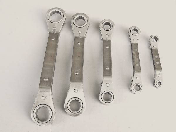 These wrenches are a set of five (5) and are box end on both ends. They have a reversing latch and have a 15 ° off-set. They are in perfect working condition with a few cosmetic scuffs.