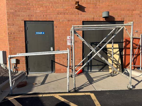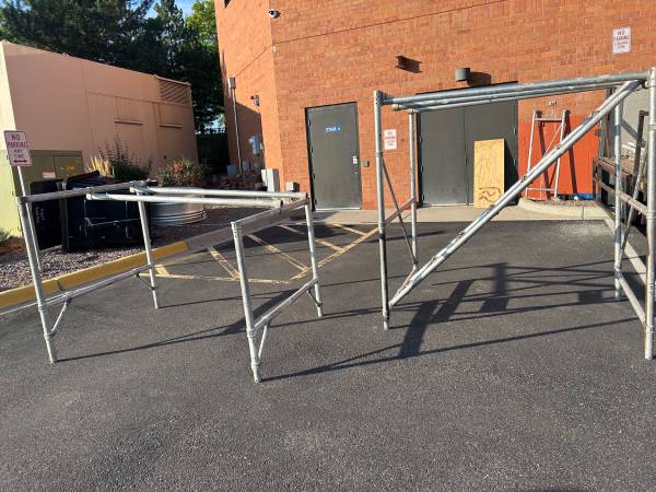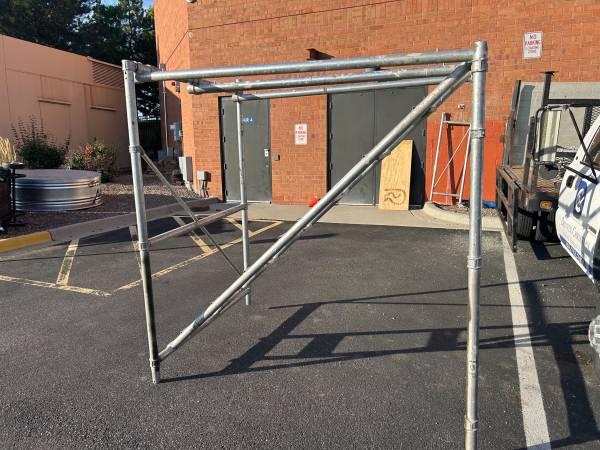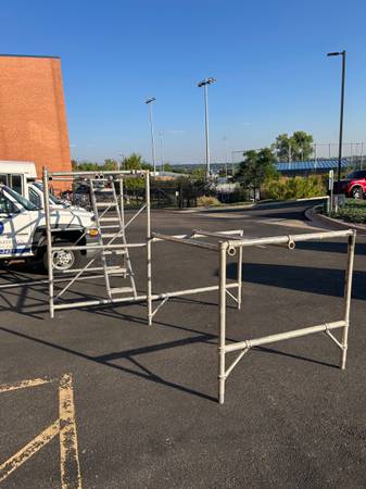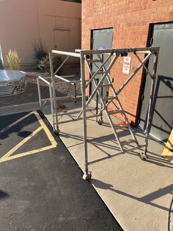 Foldable aluminum scaffold , 4 total sections, approx 20’ tall, light weight- can be assembled by one person, includes wheels and internal ladder, delivery available within 10 mile radius after...