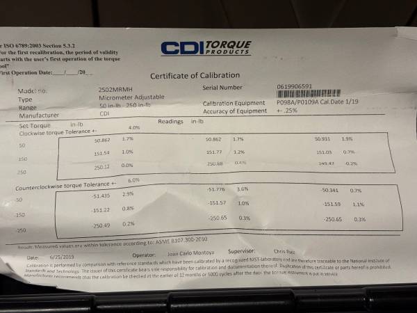 Hello selling a new in box, industrial quality CDI Torque Wrench , model 2502MRMH, 50in l s to 250 in lbs. Lists for over 230 new. Have certificate of Calibration . Professional quality , Thanks for...