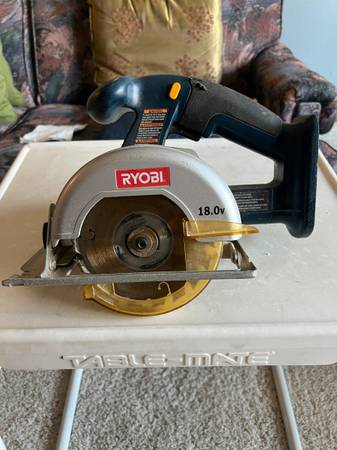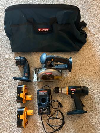 3/8 drill, 5 1/2" circular saw, adjustable worklight, 2 batteries, battery charger, manuals for the saw and worklight and Ryobi carrying case. Every thing works fine but you need to buy a circular blade for an 3/8" arbor that has a two flat sides and two round sides. I used to buy the ones from Ryobi and I knew they would fit, even though sometimes a straight round arbor blade works okay.