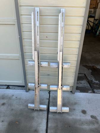 Pair of aluminum ladder jacks and are used with two extension ladders side by side. They fit stage planks for a quick scaffolding setup. These ladder jacks are made from aluminum, making them...