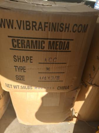 50Lb Boxes of Vibrafinish Ceramic Vibratory Tumbling media $100 a box (compare to new at $260) $80 if you take two or more AOT x 1 Box FC x 7 Boxes ACC x 6 boxes