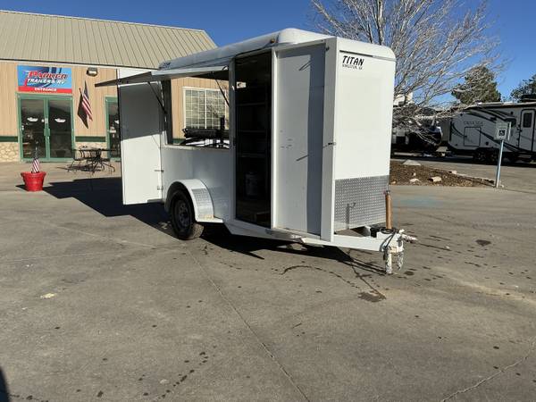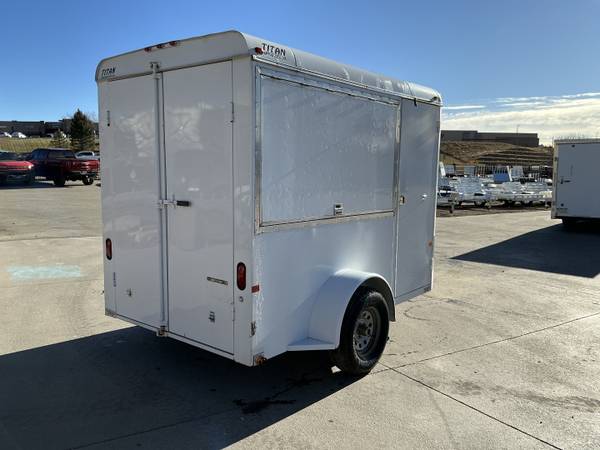 A 2009 Titan 6x10 cargo concession trailer is a specific type of cargo trailer that can be converted for commercial use. While exact specs vary by manufacturer, common features include an internal height of approximately 6'3" to 7', a single axle with a 2990 lb to 3500 lb rating, and standard concession-friendly options like serving windows and electrical packages.