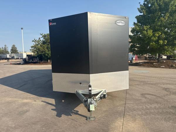 A CellTech 8.5x16 enclosed cargo trailer typically features a 16-foot long floor, an 8.5-foot width, and a 7-foot interior height. Common configurations include tandem 5200lb, resulting in a GVWR of 9990lbs. These trailers often have a rear ramp door, a 2 5/16" adjustable coupler, and are constructed with steel walls and floor.
