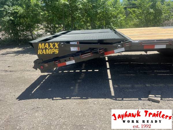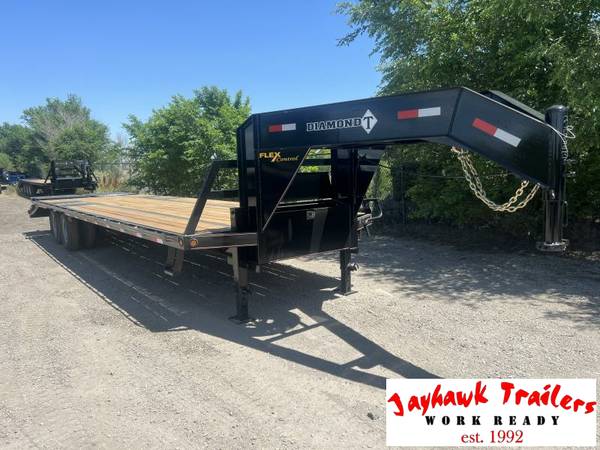 New 32’ long(27’ flat+5’ dove) 102” wide deck gooseneck from Diamond T. This trailer has 2-10k dexter axles with electric brakes and two 12k Jacks at the front. This unit has MAXX ramps on the rear with a double spring assist system to help make folding and unfolding the ramps much easier. Toolbox and mounted spare tire in the neck. The deck is stained by us to help protect against the weather.