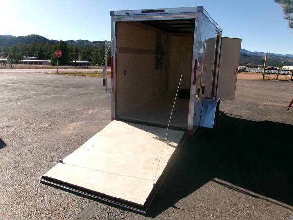 END OF FLOORING - CLEARANCE SALE: 2025 10' V-nose cargo trailer by Wells Cargo (Model Fast Trac), measures 5' x 10’ (square section), 18” V-nose (extra 1' inside), 6’ internal height, 32”x 66” side door with RV handle , rear ramp door, side wall vents, dome light, deluxe finish (0.30 exterior, 3/8 Plexcore sidewall), 16" stone guard, 3500# axle with easy lube hubs, GVWR - 2990#, Payload = 1795# (trailer weight = 1195#), 15" radial tires (205 75R15), matching spare tire, 4 500# surface wall mount rope-ring, 12” drop down stabilization jacks, exterior color = Silverfrost.