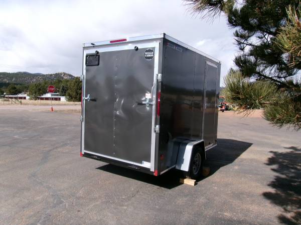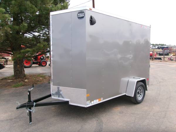 END OF FLOORING - CLEARANCE SALE: 2025 10' Enclosed V-Nose cargo trailer by Wells Cargo (Model Fast Trac Deluxe), measures 6' x 10’ (square section), 18” V-nose (extra 1' inside), deluxe finish (0.30 exterior walls, 3/8” Plexcore sidewalls, ¾” Plexcore floor), side wall vents, dome light, 16" stone guard, 3500# axle with easy lube hubs, GVWR - 2990#, Payload = 1770# (trailer weight 1220#), 15" radial tires (205 75R15), matching spare tire, variety of colors and features.