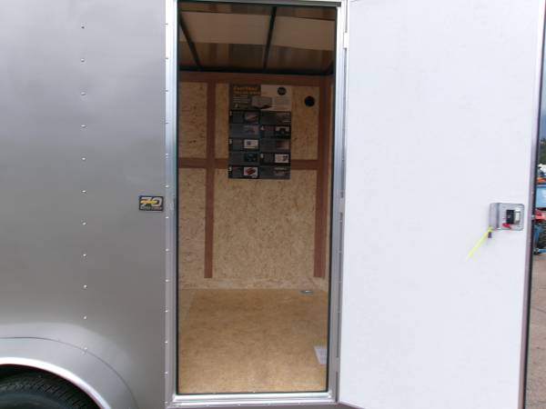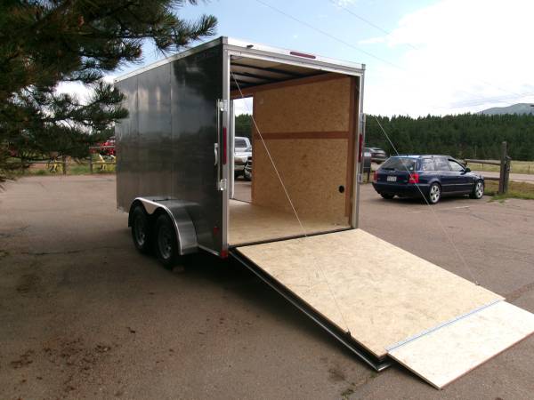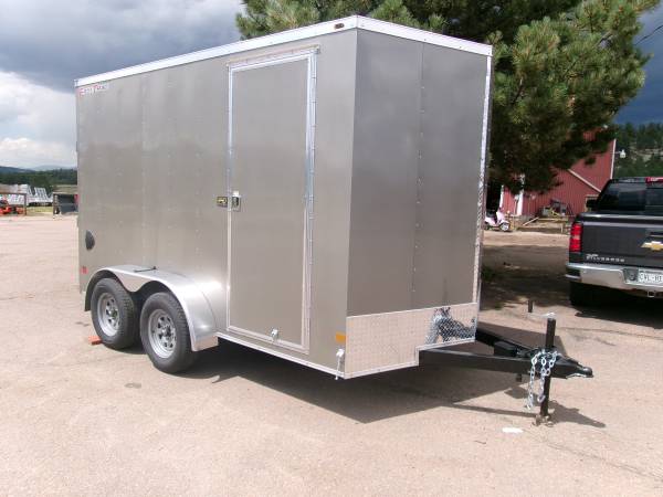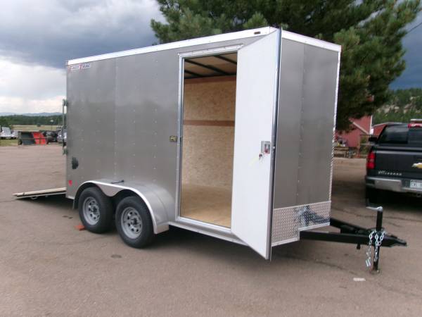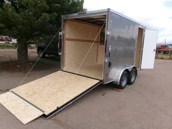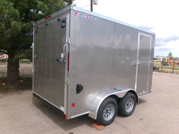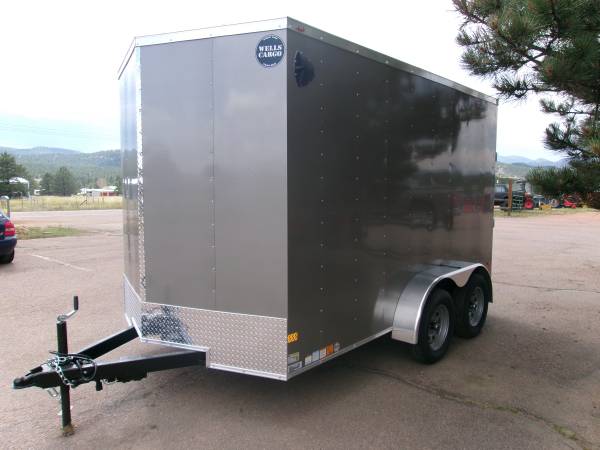 REDUCED: 2026 12' Enclosed cargo trailer by Wells Cargo (Model Fast Trac Deluxe), measures 6' x 12’ (square section), 18” V-nose (extra 1' inside), 6’6” internal height, rear ramp door, 32" side door with RV door latch, deluxe finish (0.30 exterior wall, 3/8” Plexcore sidewall, ¾” PlexCore Floor), side wall vents, dome light, 16" stone guard, tandem 3500# axles with easy lube hubs, electric brakes on both axles, GVWR - 7000#, Payload = 5260# (trailer weight 1740#), 15" radial tires (205 75R15), spare tire, 4 5000# corner floor ties, exterior color = Silverfrost.