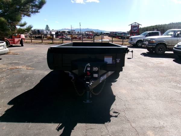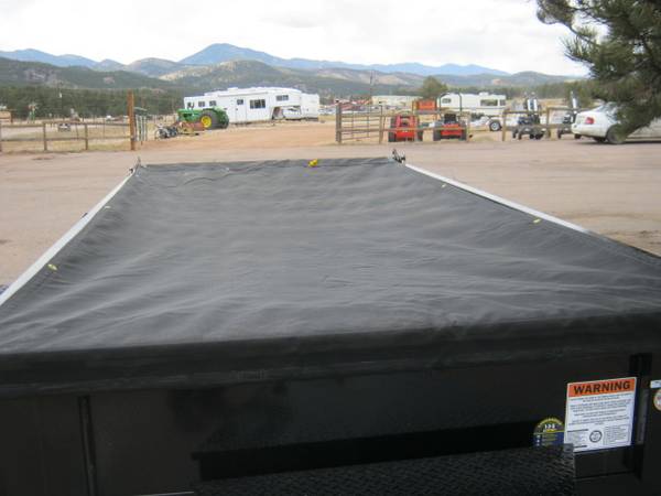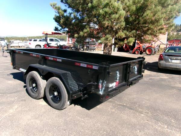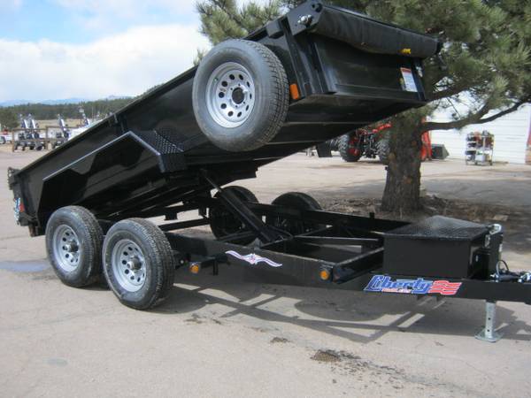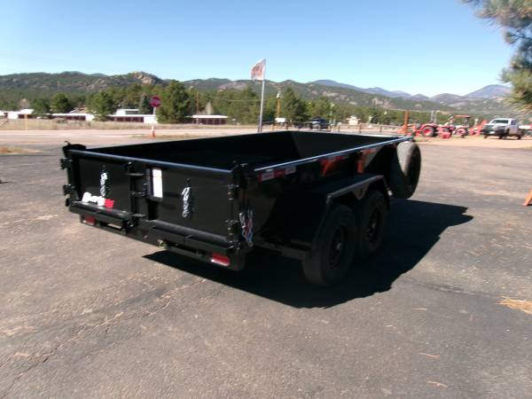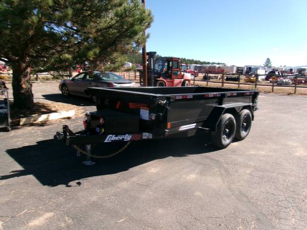 REDUCED: 2026 12' tandem axle dump trailer by Liberty Trailer, measures 72” wide x 12’ length, combo gate – barn door and spread, rear pocket ramps, 5.2K tandem axles with easy lube hubs, electric brakes on both axles, 18” sides, 7K drop leg jack, 2 5/16” adjustable coupler with chains, D Ring Tie downs, GVWR – 9990#, Payload = 7540# (trailer weight 2450#), 15" radial tires (225 75 R15), matching 15” spare tire with mount, full coverage tarp with roller, tool box and deep cycle marine battery, Color = Black.