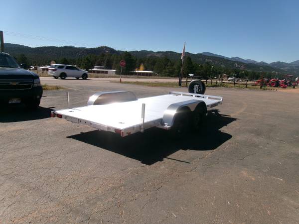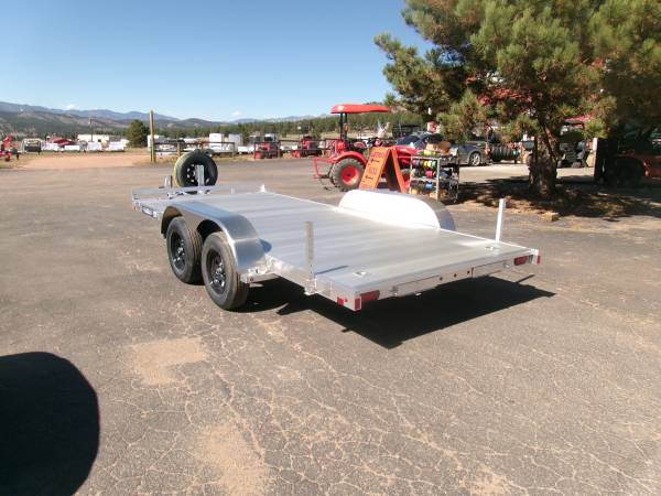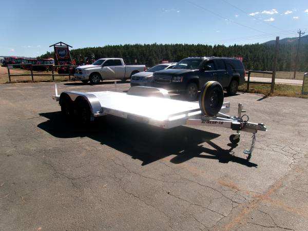 REDUCED: 2026 16' Aluminum Car Hauler by Aluma (Model 8216ESA), measures 81” x 192”, tandem 3500# rubber torsion axle with easy lube hubs, electric brakes on both axles, 6’ rear ramps in pockets, 2 rear stabilization jacks, removable aluminum fenders, 4 2000# recessed tie rings, 6 stake pockets (3 per side), 14" radial tires with black steel wheels, matching spare with mount, GVWR = 7000, payload – 5682# (trailer weight - 1318#), Aluma exclusive 5 year frame warranty.