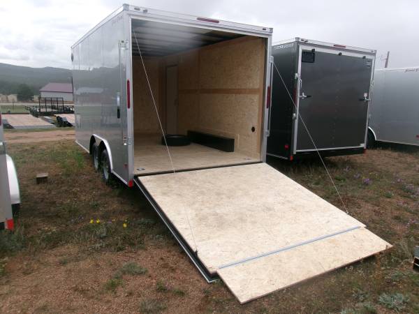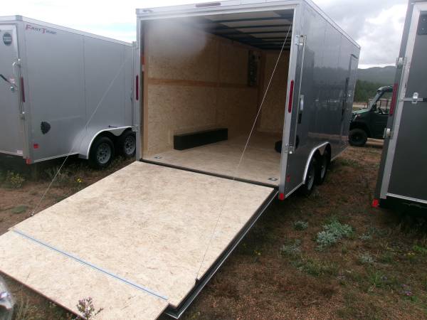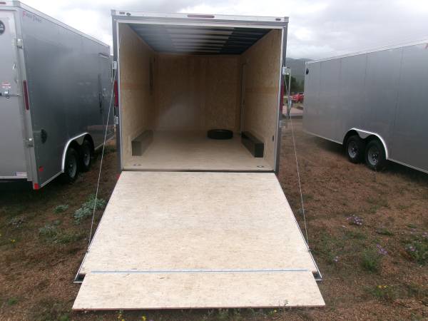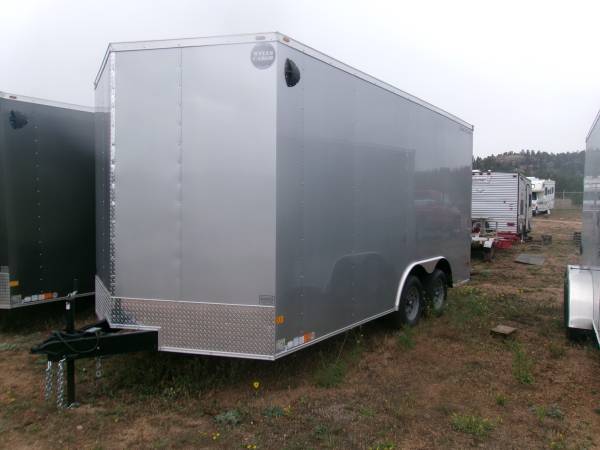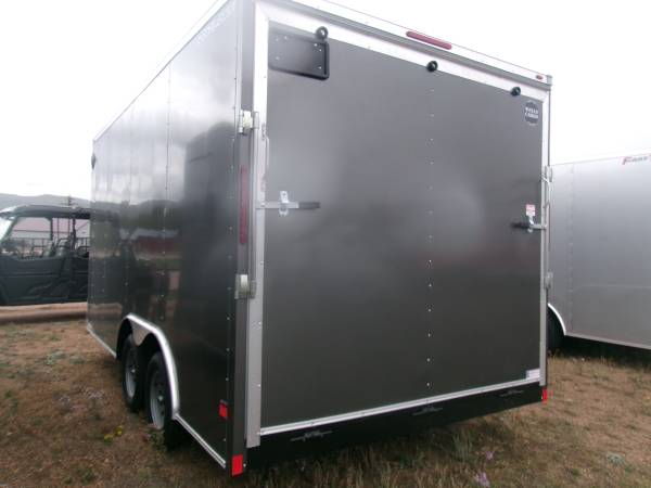 REDUCED: 2026 16' enclosed cargo trailer by Wells Cargo (Model FastTrac), measures 8'6” x 16' (square section), 18" V-nose front (extra foot inside), rear ramp door with 16” ramp extension, 7’6” inside height, 32” side door with grab handle, RV door latch and bar lock assembly, deluxe finish (0.30 exterior, 3/8 Plexcore sidewall), side wall vents, dome light, tandem 3500# axles with easy lube hubs, electric brakes on both axles, GVWR - 7000#, Payload = 4180# (trailer weight 2820#), 15" radial tires (205 75R15), matching spare tire, 16' stone guard, LED lights, 4 5000# square welded corner ties, 12” drop down stabilization jacks, exterior color = Charcoal Gray or Silverfrost.