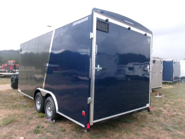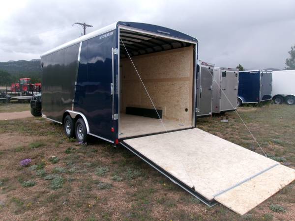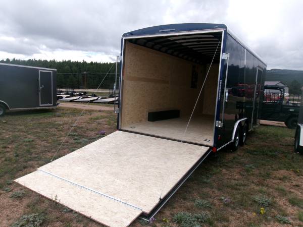 REDUCED: 2026 18' enclosed cargo trailer by Wells Cargo (Model Road Force), measures 8'6” x 18', square front and round roof, rear ramp door with 16” ramp extension, 7'6” inside height, 36” wide side door with RV handle, bar lock assembly and recessed step, flow thru side wall vents, 2 LED dome lights with wall switch, tandem 5200# axles with easy lube hubs, electric brakes on both axles, GVWR - 9990#, Payload = 6990# (trailer weight 3000#), 15" radial tires (225 75R15), matching spare tire with exterior carrier and cover, 2' stone guard, square welded corner ties, rear 5000# drop down stabilization jacks, exterior = Multicolor – Charcoal Gray and Indigo Blue.