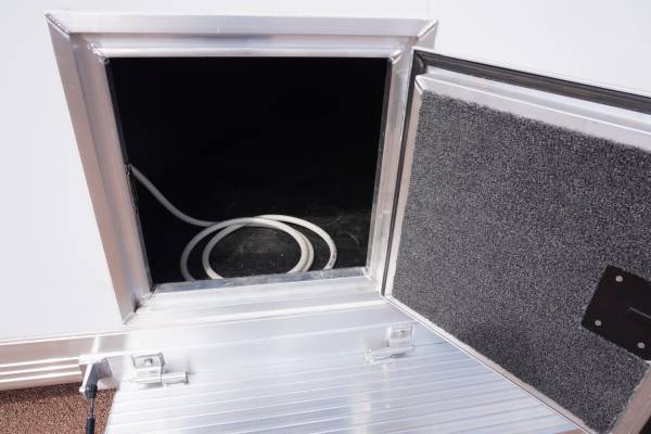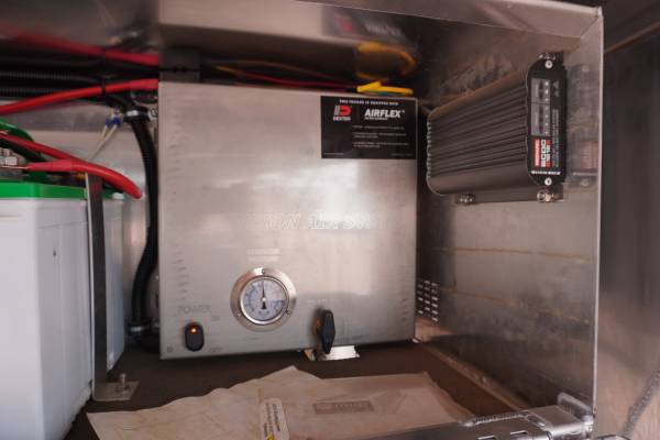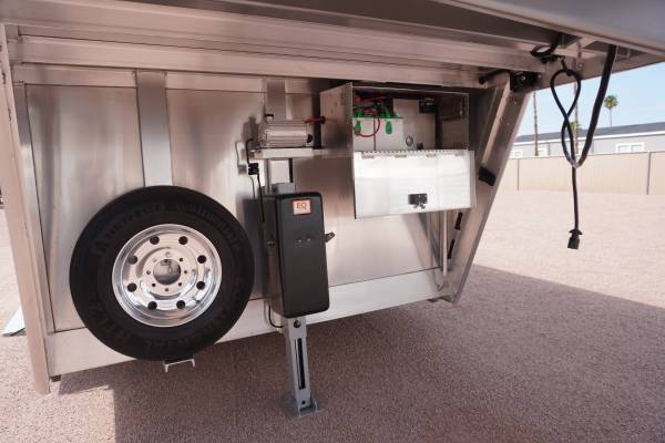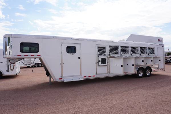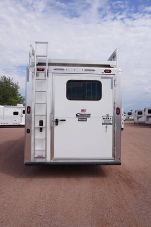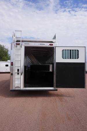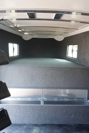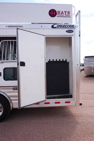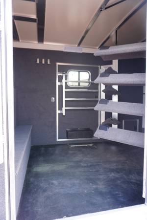 The 8' dressing room has doors on both sides, consists of 2 sets of swing out blanket bars and 4 tier swing out saddle racks, brush buckets, bridle hooks, 25 gallon water storage w/outside access door, boot box and lots of storage room in the nose. Come and check this beauty out for yourself!