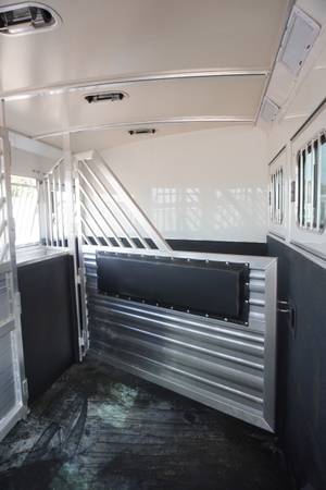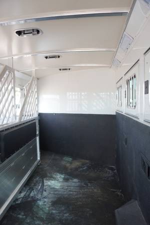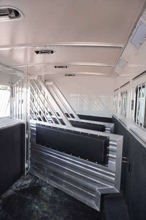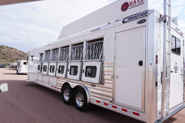 This trailer is 8ft wide and 7'8 Tall, has drop-down windows on the head and tail side, features fully insulated roof, lined and insulated horse compartment, polished extruded aluminum, mangers, escape door, broom closet with bridle hooks and integrated hay pod. Stainless steel nose, hydraulic jack, 8k axles, 17.5 Aluminum wheels, 245/70 R17.5 Continental with electric/ hydraulic disc brakes, easy angle ladder, and LED exterior/interior lights.