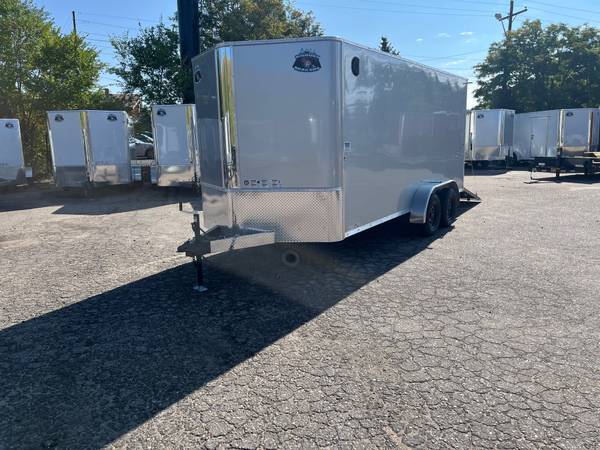 This is a new 2026 7x16+v-nose R&M Standard Grade enclosed cargo trailer Tandem Axle Flat roof V nose located at our Wheat Ridge store on sale ---FOR sales please call in advance!