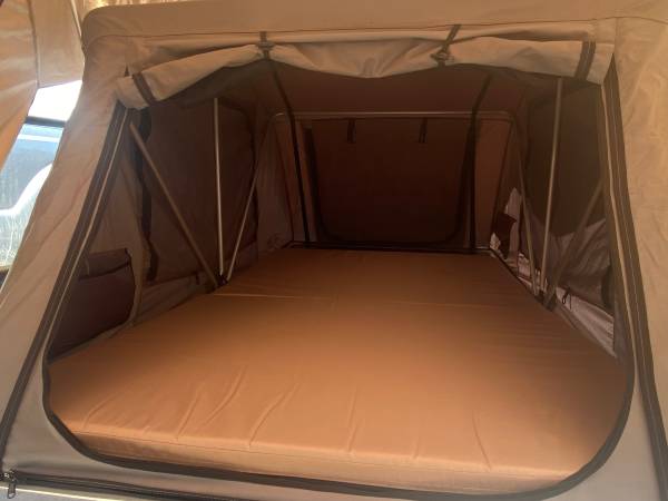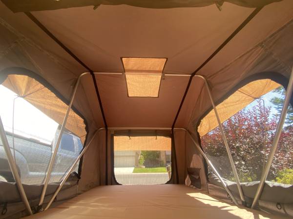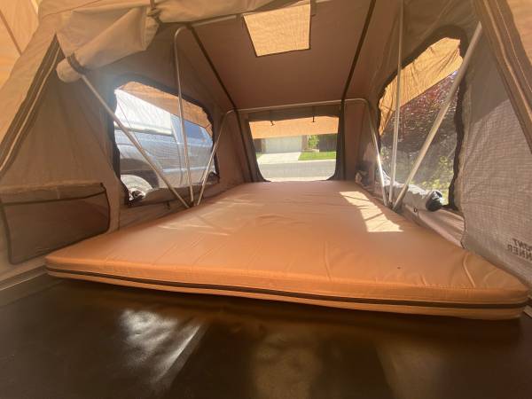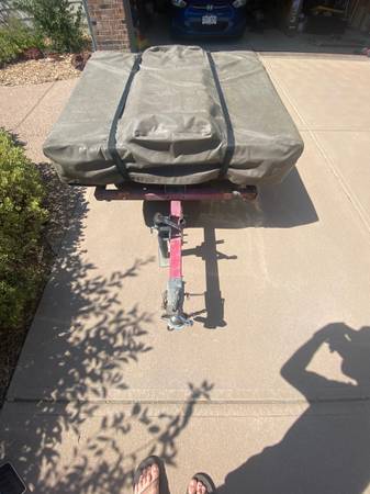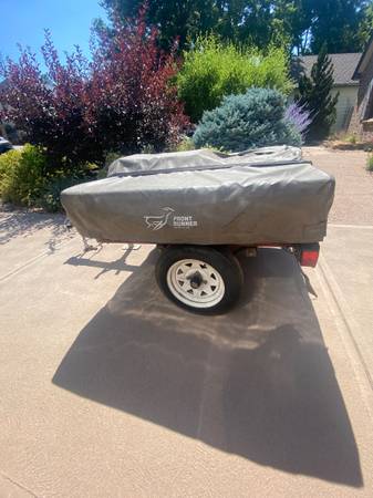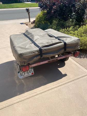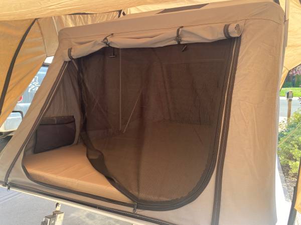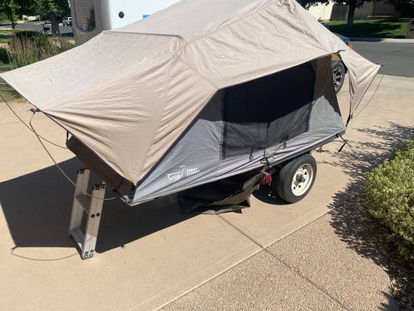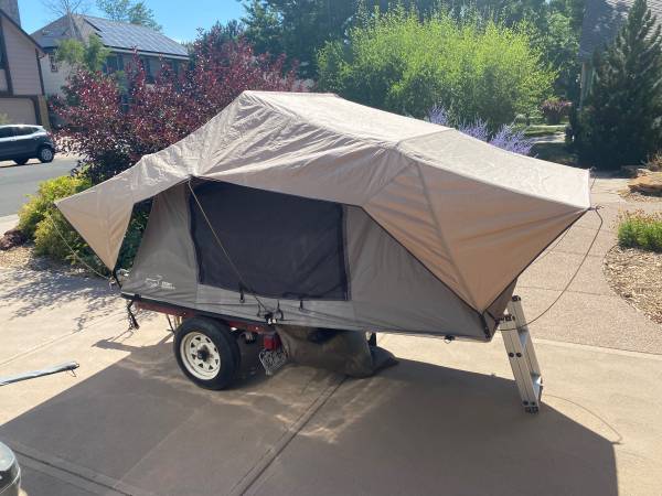 FrontRunner Featherlite rooftop tent mounted on a 4x4 foot utility trailer with integrated jacks for leveling. Some benefits I’ve appreciated of the trailer over a roof rack mount