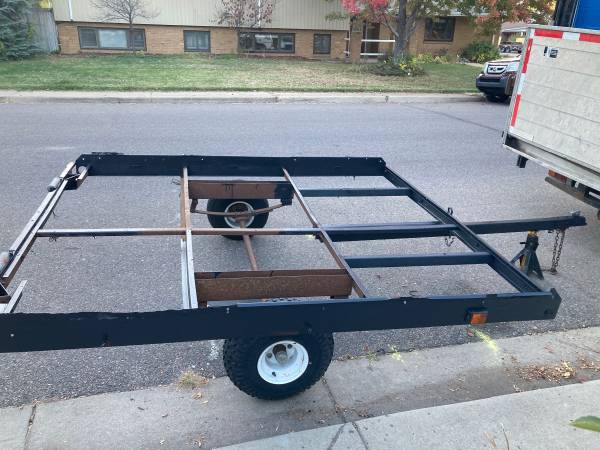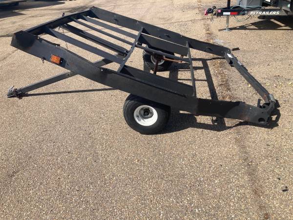 The trailer frame was bent/damaged on one side when we were loading it for deck replacement. We have new "bent-metal" to repair the damage and will include it. You'll have to do the metal repair yourself. Takes a 2" ball. Selling it As Is, NO Tiltle. Bring magnetic lowlights and tow it home. Please include your #. Thanks.