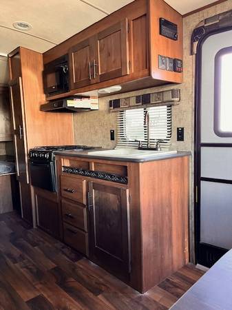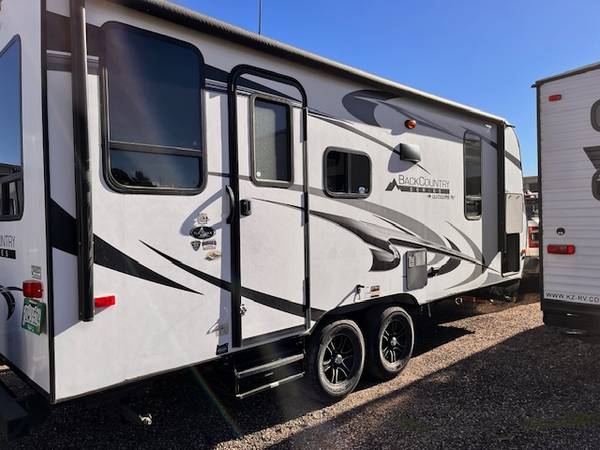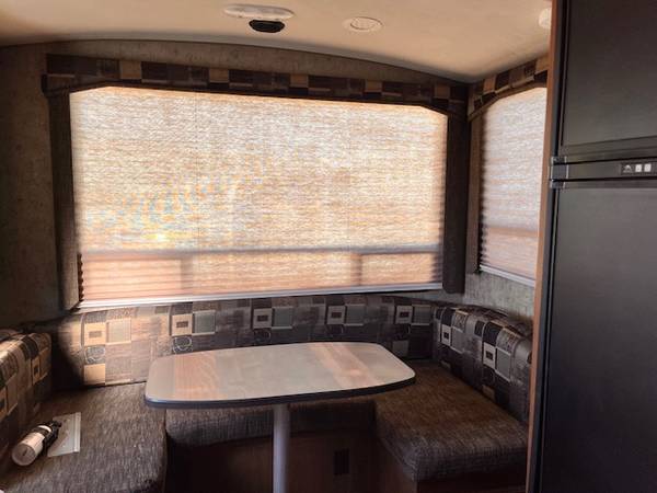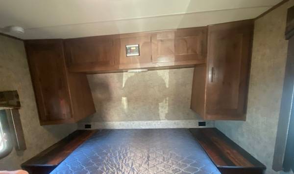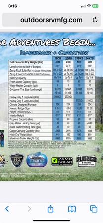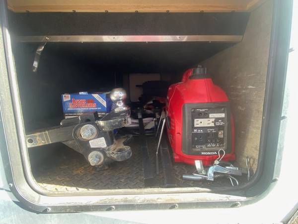 Perfect off grid rig. Factory solar, 4 season design, 2 new batteries, 2 -30 lb propane tanks, off road suspension, Thermopane windows, and aluminum frame. Included Honda 1000 watt inverter, Blackstone grill, HD weight distribution hitch. 1/2 ton pickup tows comfortably. No slide. 6,990 lbs.