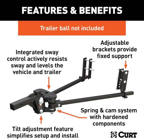 •EASY SETUP. This CURT weight distribution hitch with trailer sway control is designed for fast, easy setup and adjustment. It features a tilting head with hex castle nuts for easy adjustment without completely disassembling the hitch