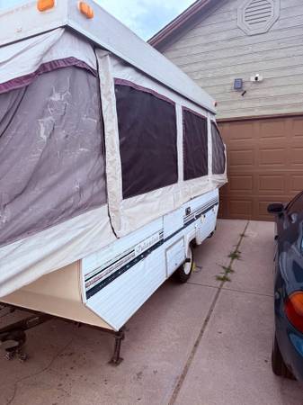 My 1996 pop-up camper is for sale, sleeping six people comfortably. It's equipped with an inverter, solar panel, and two batteries. The camper also features a propane stove for outdoor cooking and a screen door. The interior has been remodeled for a cozy atmosphere.