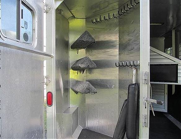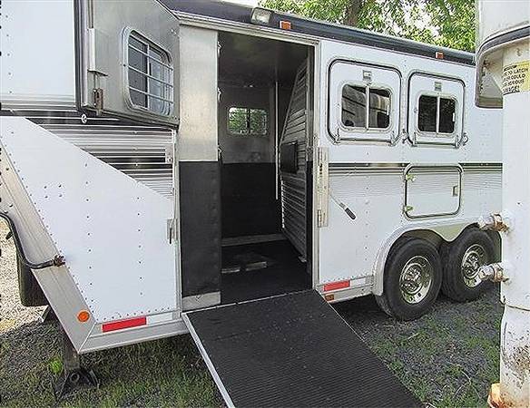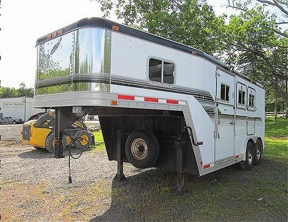 1994 Featherlite 3 horse gooseneck trailer, 8' wide, 7' tall, all aluminum. side ramp at stall one, half-width rear ramp, solid rear tack with saddle racks, mangers, dressing room, and onboard water...