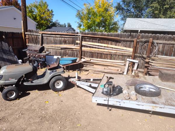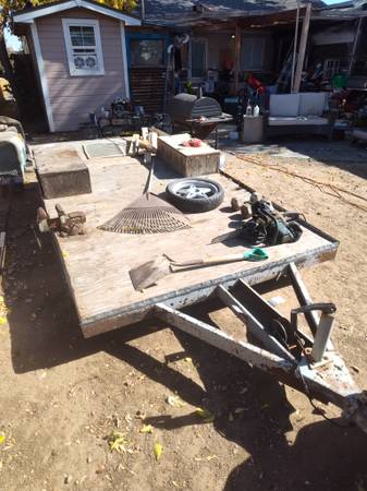 Garden tractor has the mower deck included and runs good. Garden tractor has a hitch ball on the back of it and pulls this trailer around fine. The trailer used to be a box trailer with ramp but it was rotted so I tore it all off. The deck is solid as a rock and it still has the hinge on the back for a ramp. Trailer has a clean title but I don't have it. This was given to me by a customer in trade for work and he didn't know where the title was so I told him not to worry about it.