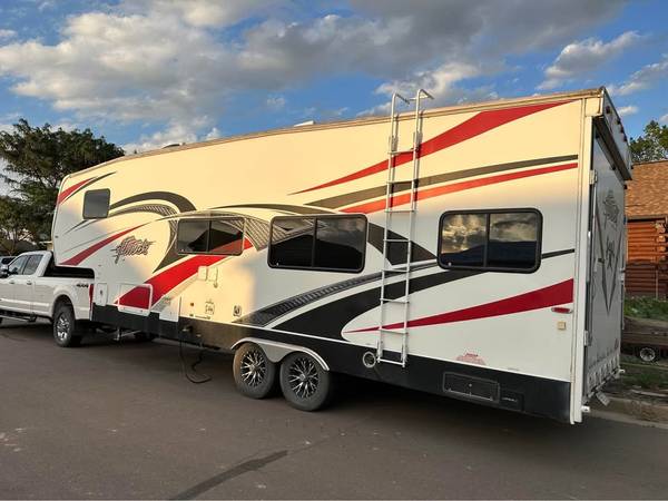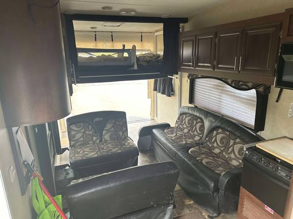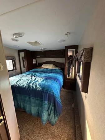 2014 L28 SAG. Overall length is 32 feet and 8 feet 6 inches wide. Has Onan generator 4000 with new carburetor and air filter runs great. Fueling station and A/C. Sleeps up to about 10, has 2 bunk beds, couch bed, table bed and and queen size bed in master room. We have put one 500cc 4 wheeler and 2 90cc four wheelers in it and another time 2 full size four wheelers and a 450 dirt bike. Has the 20k goosebox and some other add ons. Electric awning but fabric needs replaced. Can send more upon request. Only selling to down size, we did not use enough to justify the toy hauler part.