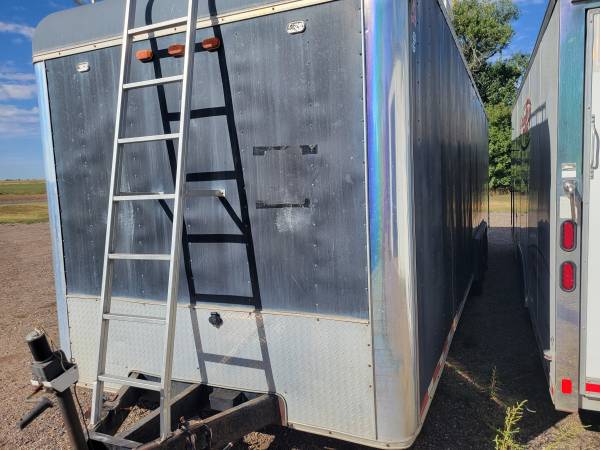 32' Triple axle racecar trailer. NO TITLE, comes with bill of sale only. Trailer has 6 brand new tires. It had a roof leak that is now fixed. Trailer is in fair shape. It is now leak proof and pulls very well. Still room to add a golf cart with the gto inside the trailer.