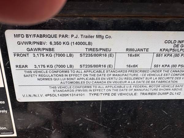 2019 PJ 7' x14' dump trailer in great condition. It has no dents and a brand new battery. The tires are ok and the lift works great. I am looking for $9000 or best offer. No low ball offers accepted.