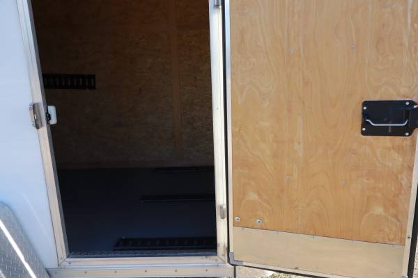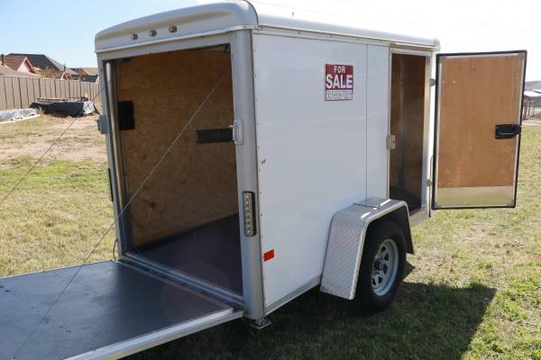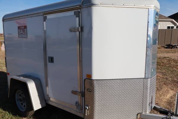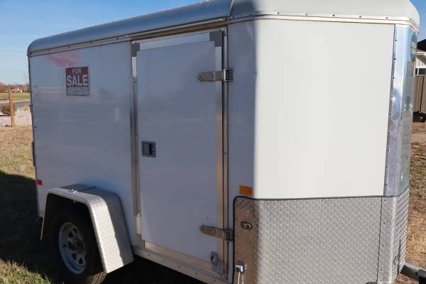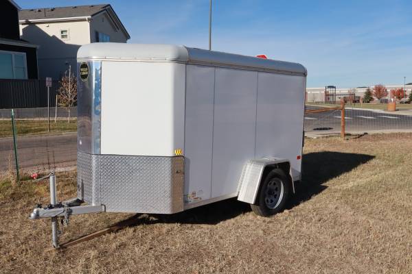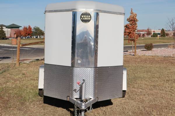 Wells Cargo SW8 (5X8). Enclosed. Very close to NEW condition. Side entry door (non street side). Single rear door. One piece seamless aluminum roof. 2 interior lights. Single axel. GVWR 2750 lbs. payload capacity 1930 lbs. .030prefinished aluminum exterior. 3/4 inch plywood flooring (just painted). 15 inch aluminum tread plate fenders & 24 inch tread plate stoneguard.
