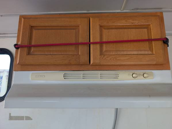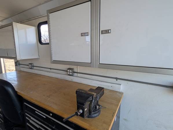 There are Waterloo built in tool chests, a kitchen type light and exhaust fume hood, two work benches and an vise. Mini-fridge, and a couple of overhead cabinets as well.