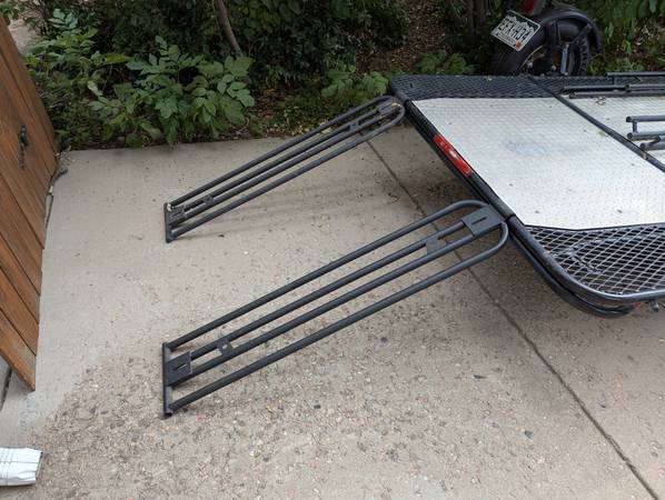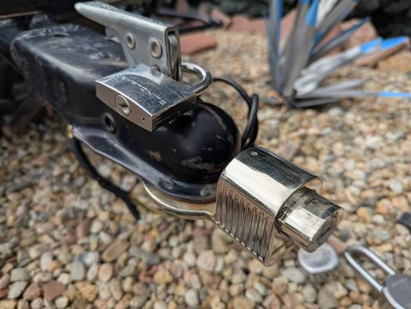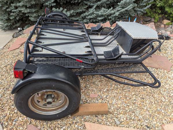 Sale includes a trailer dolly and two motorcycle ramps. Includes cargo box with lock and key. Also includes two trailer hitches, 5 locks and a cable.