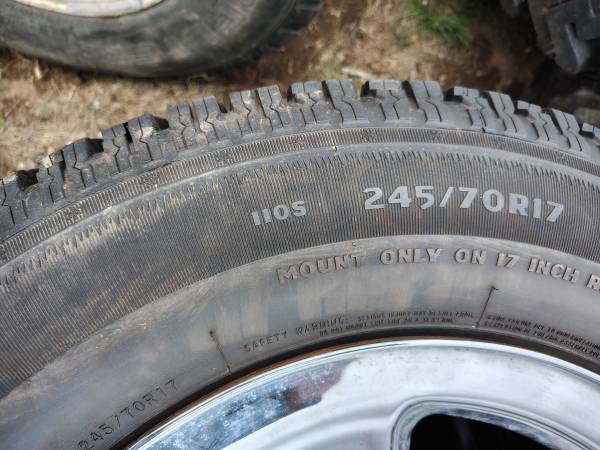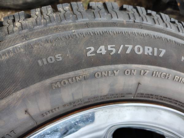 2 Studded snow tires 245 70 R17. 5 Bolt spacing 5.25" fits Chrysler Dodge Jeep vehicles? perhaps not over brake caliper – use spacer.