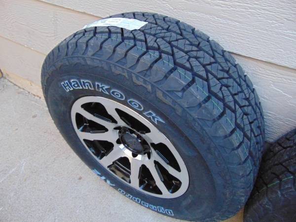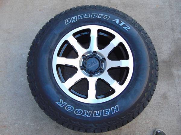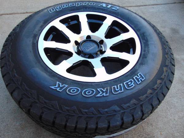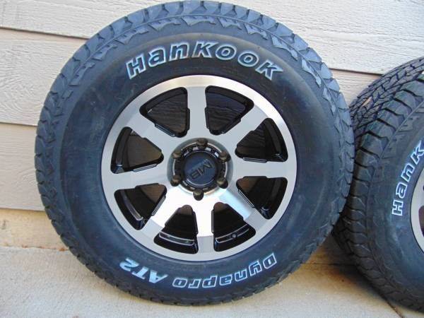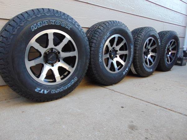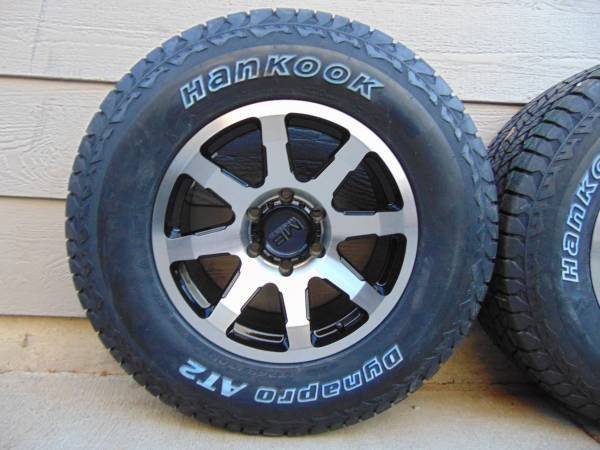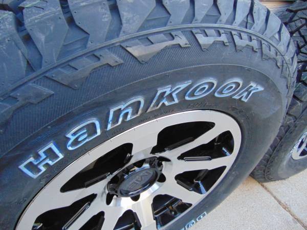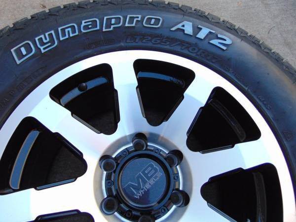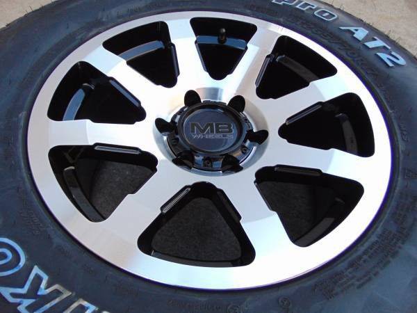 **$1,400 FIRM NO OFFERS NO TRADES PLEASE** These wheels are made by MB and the model is Legacy they have a 6X5.5 bolt for Chevy and GMC, as well as most 6 Lug Toyota and Nissan Trucks, these rims have a +18MM offset. The tires are Brand New LT 265 70 17 Hankook DynaPro All Terrain 10ply Tires. Call Karl at show contact info