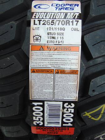 *Only 2 tires available at this time* **$400 CASH FIRM NO OFFERS NO TRADES PLEASE** If you want to buy these 2 New LT 265 70 17 Cooper Evolution M/T Tires Tires, call Karl at show contact info