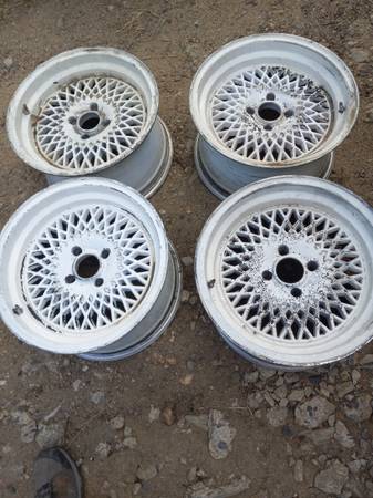 I have 4 15x8 aluminum lace style rims for sale. They are 4 on 100mm bolt pattern. They fit Honda and Toyota for sure. There are most likely several cars they will fit. These wheels are very light. they were originally white and have several coats of spray paint on the face. I don't want to scrap them if someone can use them. I can meet you in the Golden, Arvada, Lakewood area if I am already headed to town anyway. Text or call and I will call you back.