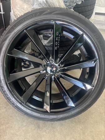 Like new gianelle Verdi koko culture 22” black gloss rims and tires, both patter 5x114 , comes with universal tpms sensors, tires are like new with 85% life left , I buy 2 years ago in ktc audio and wheels but only used for one summer , asking $2000 obo,,