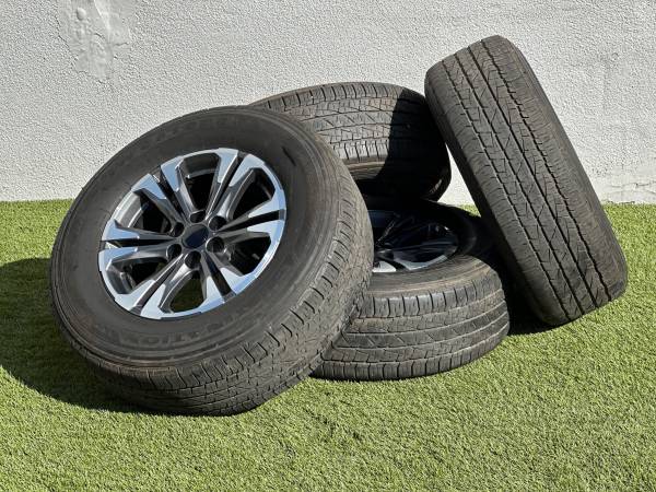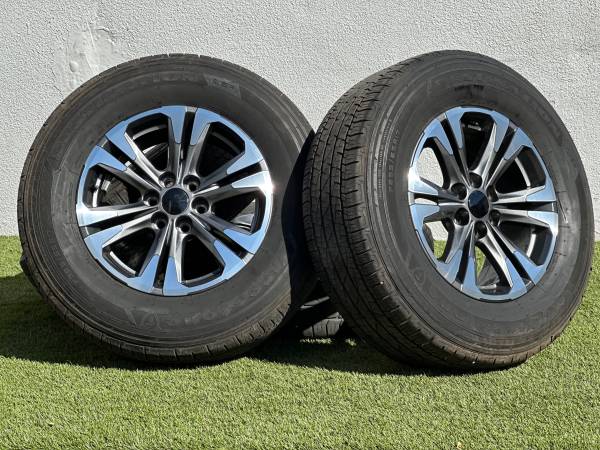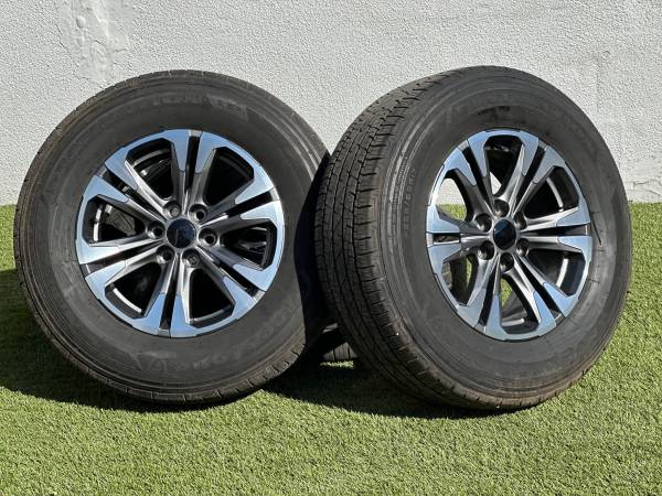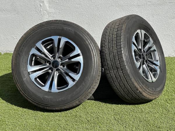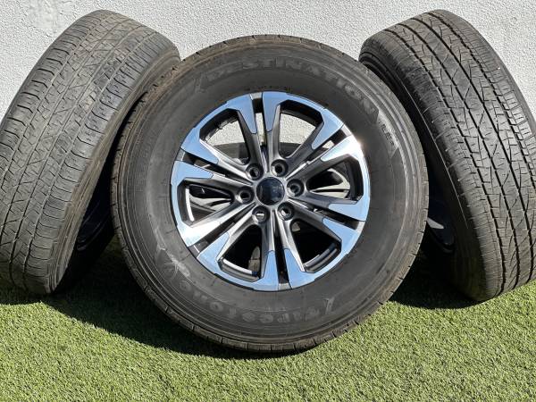 Excellent condition 17" Chevy Colorado OEM wheels in charcoal grey and polished silver factory finish, wrapped in Firestone Destination LE2 265/65R17 tires.