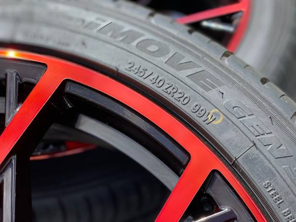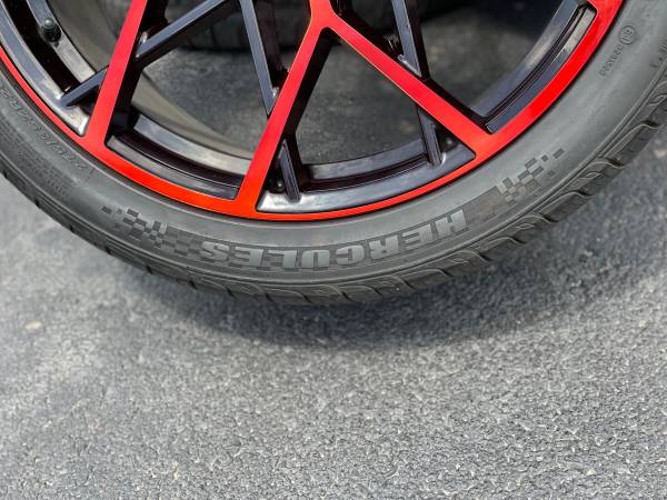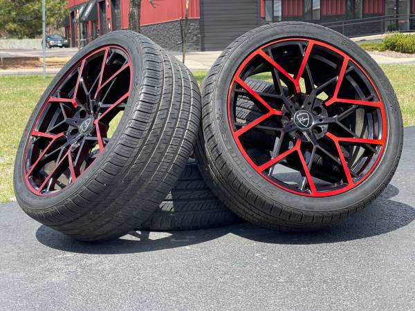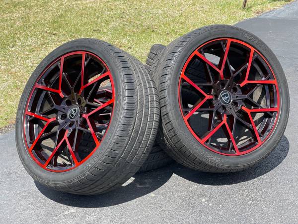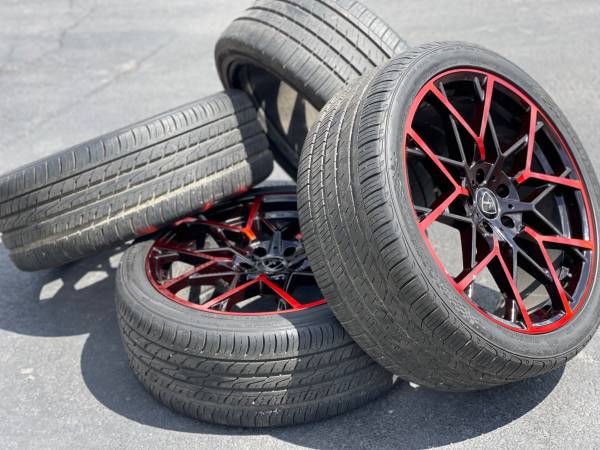 20” Elegant Rims 5x114.3 nice black and red original finish wrapped in staggered tires from an 2021 Infinity Q50 but will fit other cars (read below)