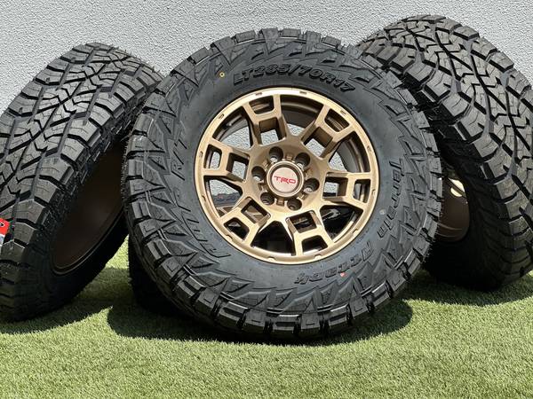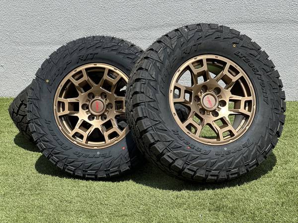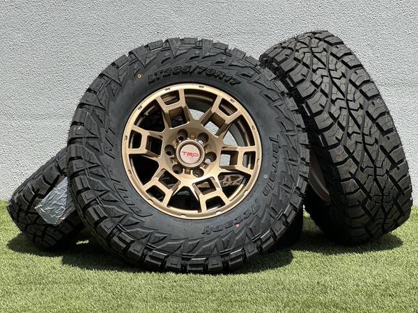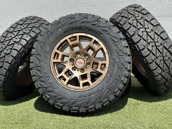 Brand NEW set of AGP 17” TRD Pro Style wheels in bronze finish (black or silver also available), paired with AMP Terrain Attack R/T LT285/70R17 tires. These rugged terrain tires are Load C, 6 ply rated for 50k miles with warranty — a strong 33” setup perfect for off-road use or lifted builds.