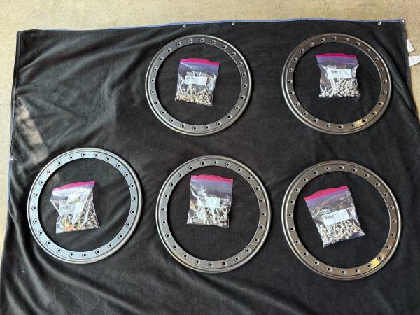 Set of 5 AEV Borah Dual Sport wheels that can be configured as a Beadlock (requires Beadlock Ring) or used without any rings or run with protection rings (included and shown in pictures) These are perfect for Jeep Wrangler and Gladiators and have a +25mm offset. Complete specs are on AEV's Website.