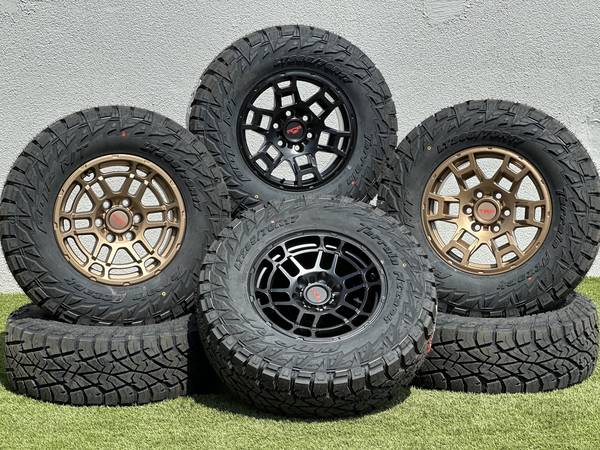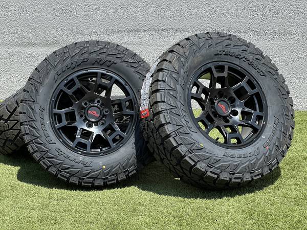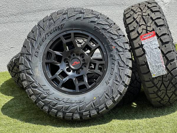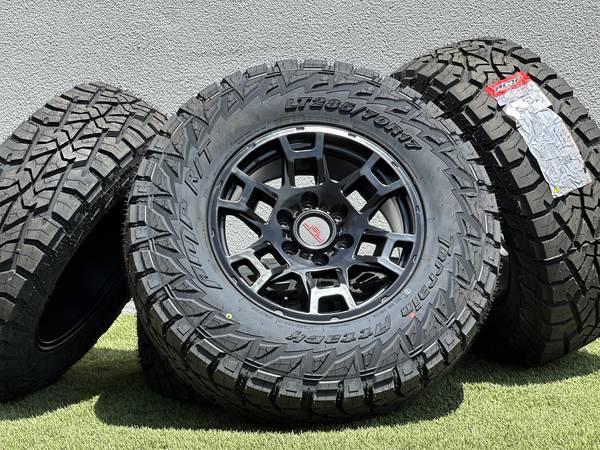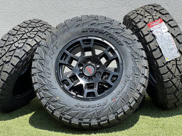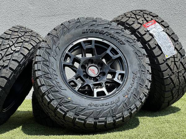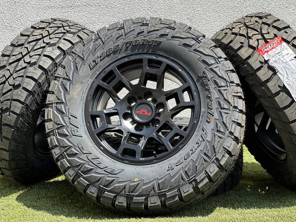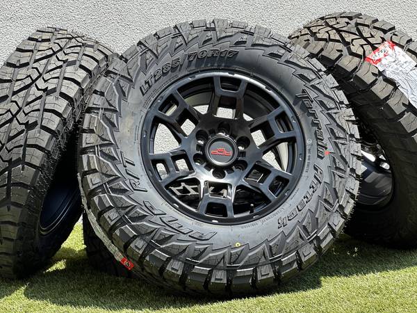 Brand new 17” TRD Pro Style wheels finished in black (silver or bronze finishes also available), wrapped in AMP Terrain Attack R/T LT285/70R17 tires Rugged All Terrain. These Load C, 6 ply tires are designed for rugged terrain use with great on-road comfort and solid off-road grip.