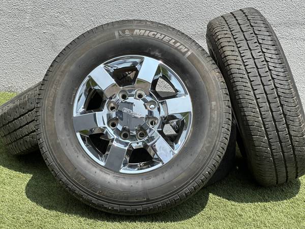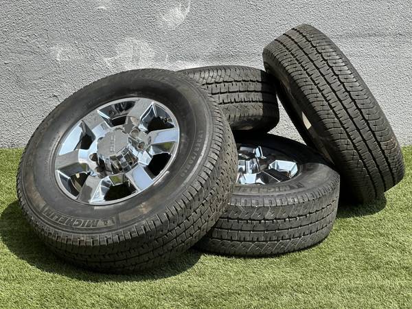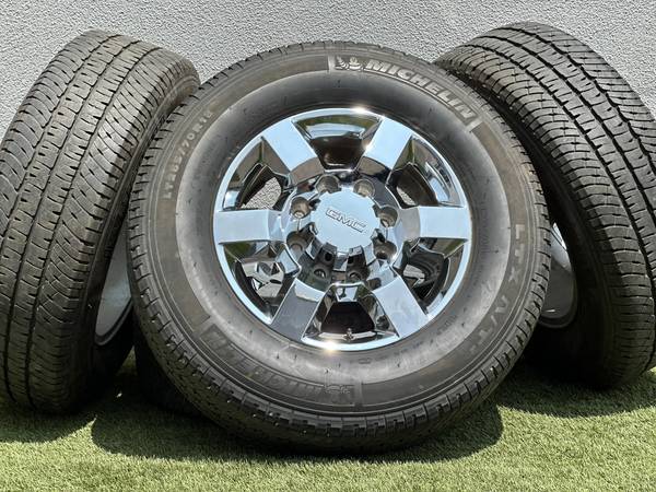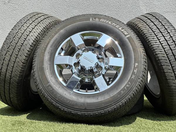Excellent Condition 18” GMC Sierra Wheels OEM Chrome rims LTZ, Fit Sierra 3500 Original and Sierra 2500 wheels wrapped in Michelin LTX A/T2 All Terrain LT265/70R18 Tires