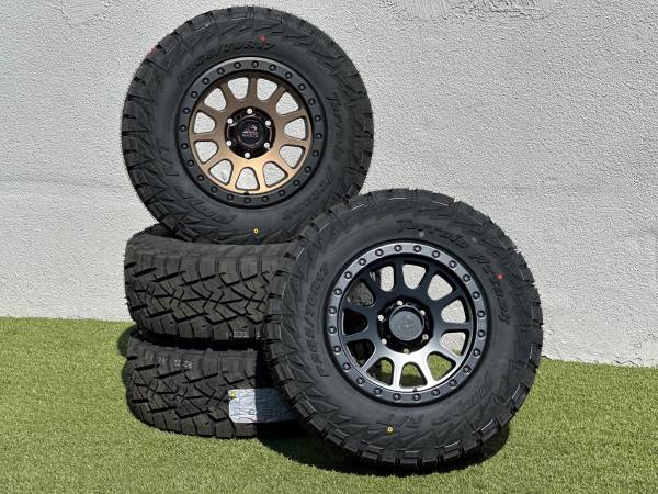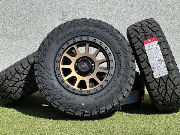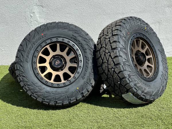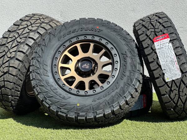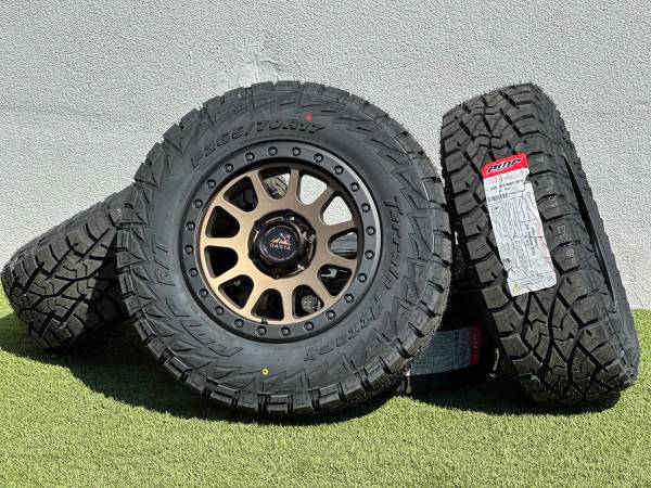 Brand new 17” Basta Rotary Forged RF1 wheels in Bronze finish (full Black also available), wrapped in AMP Terrain Attack R/T P265/70R17 tires. These are passenger-rated rugged-all-terrain hybrids that ride smooth on the highway with confident all-weather traction with a 50k manufacturers warranty.