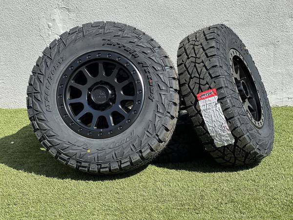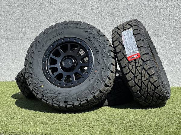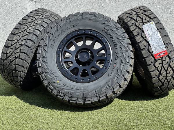 Brand new 17” Basta Rotary Forged RF1 wheels in Black finish (Bronze also available), wrapped in AMP Terrain Attack R/T LT285/70R17 rugged-terrain tires.