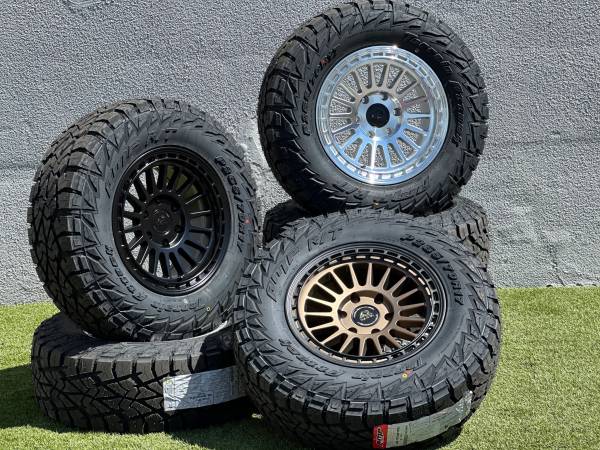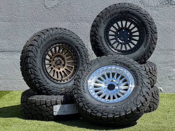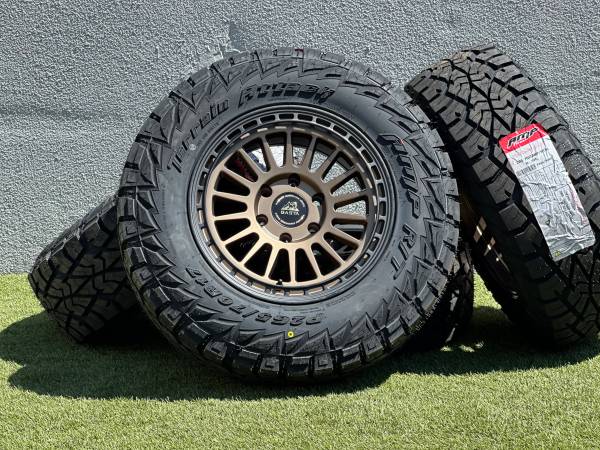 Brand new 17" Basta RF3 wheels in Bronze (Black or Polished Silver also available), wrapped in AMP Terrain Attack R/T P265/70R17 tires.