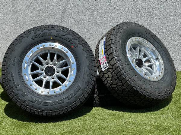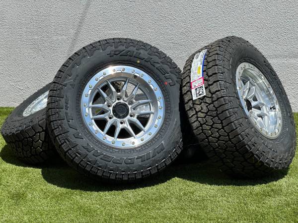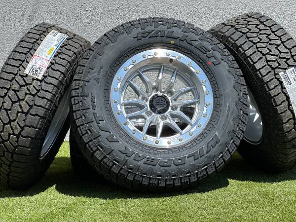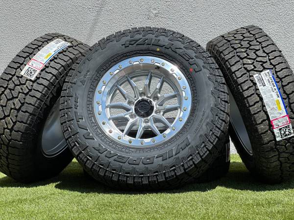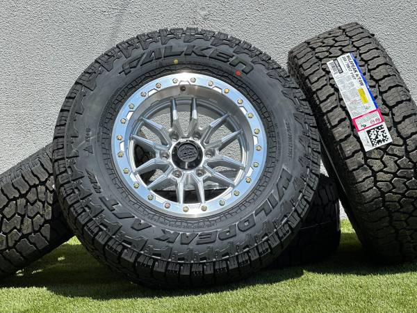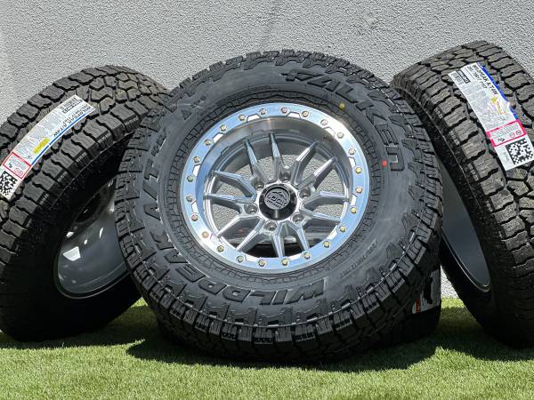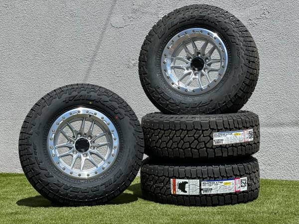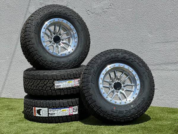 Set of 4, NEW 17” Lock Off-Road Krawler wheels in Polished Silver finish (also available in Black, Bronze, or Grey), wrapped in Falken Wildpeak AT4W Tires size P 285/70R17 All Terrain.